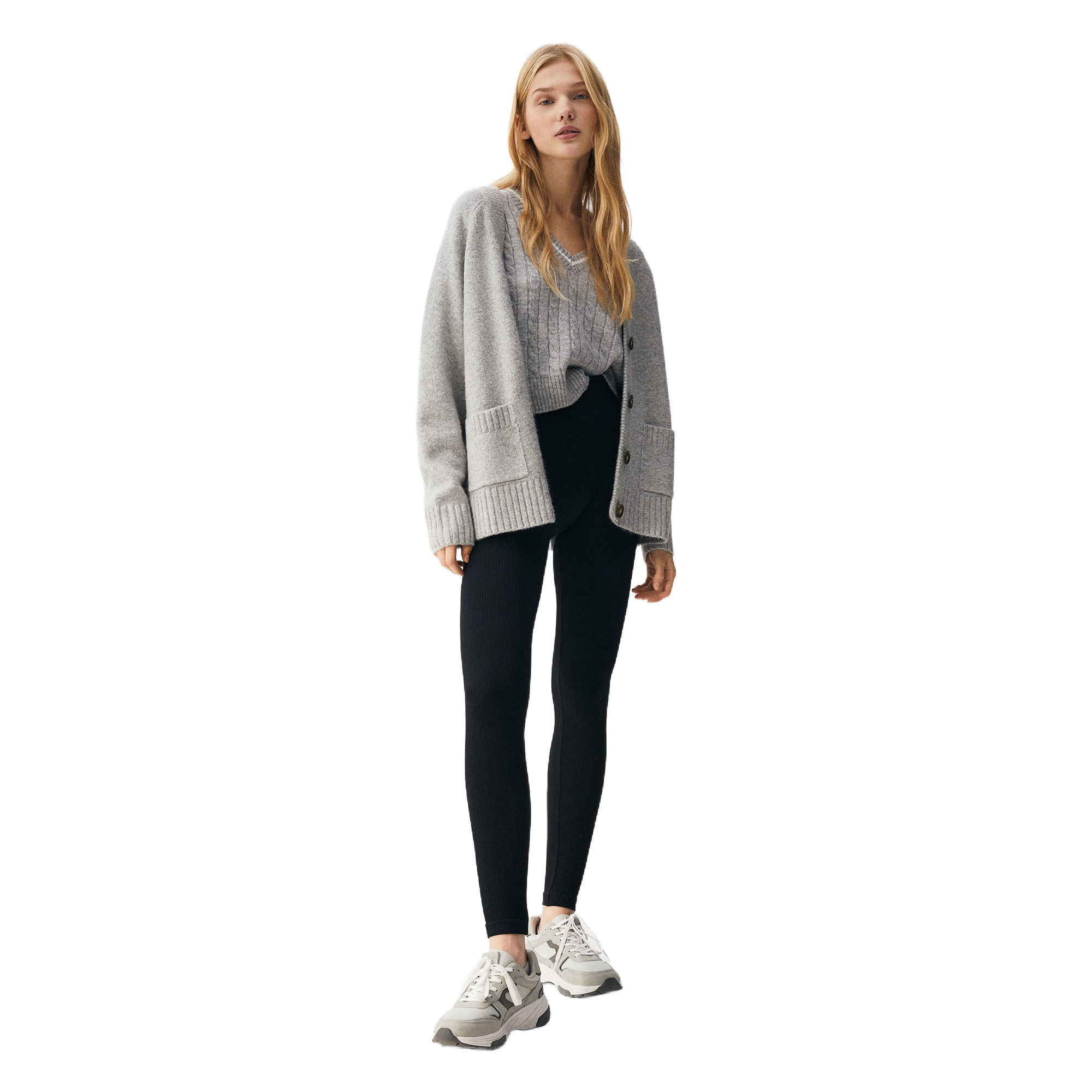 High-rise relaxed-fit leggings in soft stretch fabric with wide comfortable waistband and straight ankle length. Effortless everyday essential in neutral tones.